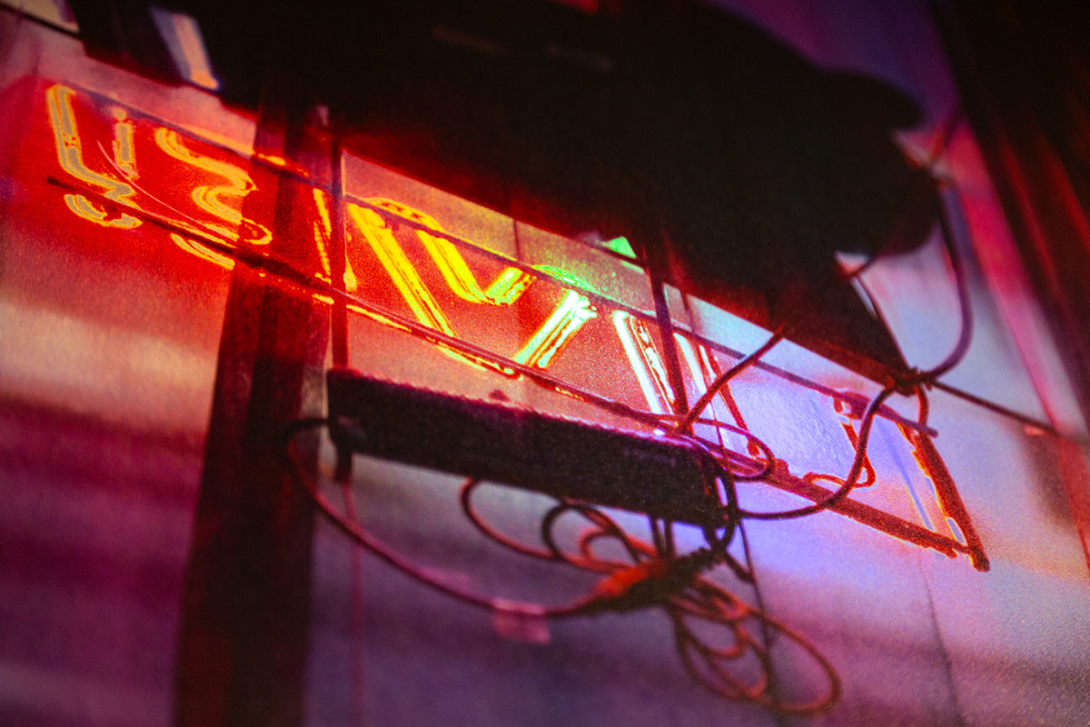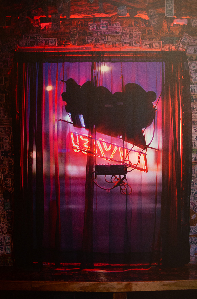 The materiality (prints on holographic cardstock) in this series explores concepts such as: Craft, “girl” aesthetic, distortion, impermanence and reflection. The highly reflective, color changing surface references a non-art culture (think Lisa Frank stationary and stickers) while also mimicking a 90’s digital aesthetic (animated gifs.) The image continually changes as the viewer moves around the pieces, representing the ever changing nature of digital content and personal experiences with it. The images selected for this project investigate the idea of Americana through objects and spaces. Subjects such as Elvis (still being photographed almost 50 years after his death) or a miniature Eiffel Tower in Michigan convey ideas of celebrity, simulation and originality. | ![]() Visions from Graceland 36" x 24" UV print on holographic paper mounted to acrylic 2025 |