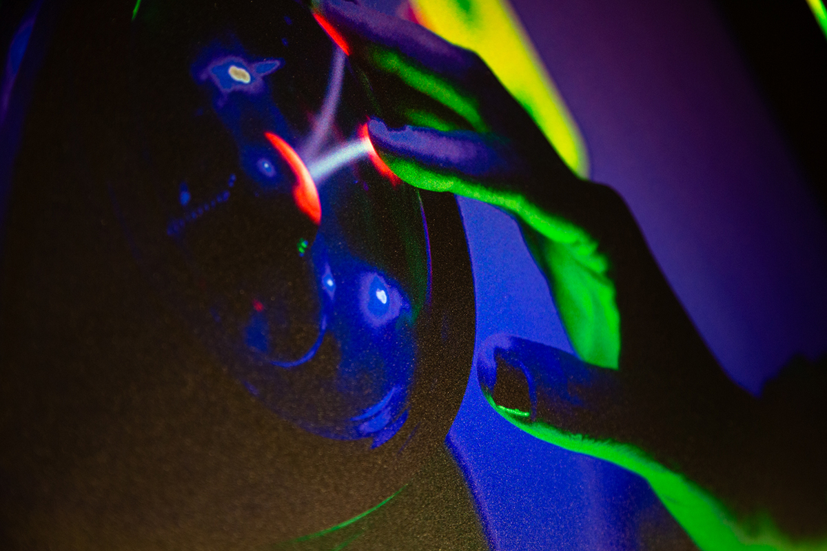 The materiality (prints on holographic cardstock) in this series explores concepts such as: Craft, “girl” aesthetic, distortion, impermanence and reflection. The highly reflective, color changing surface references a non-art culture (think Lisa Frank stationary and stickers) while also mimicking a 90’s digital aesthetic (animated gifs.) The image continually changes as the viewer moves around the pieces, representing the ever changing nature of digital content and personal experiences with it. The images selected for this project investigate the idea of Americana through objects and spaces. Subjects such as Elvis (still being photographed almost 50 years after his death) or a miniature Eiffel Tower in Michigan convey ideas of celebrity, simulation and originality. | ![]() Visions from Graceland 36" x 24" UV print on holographic paper mounted to acrylic 2025 |